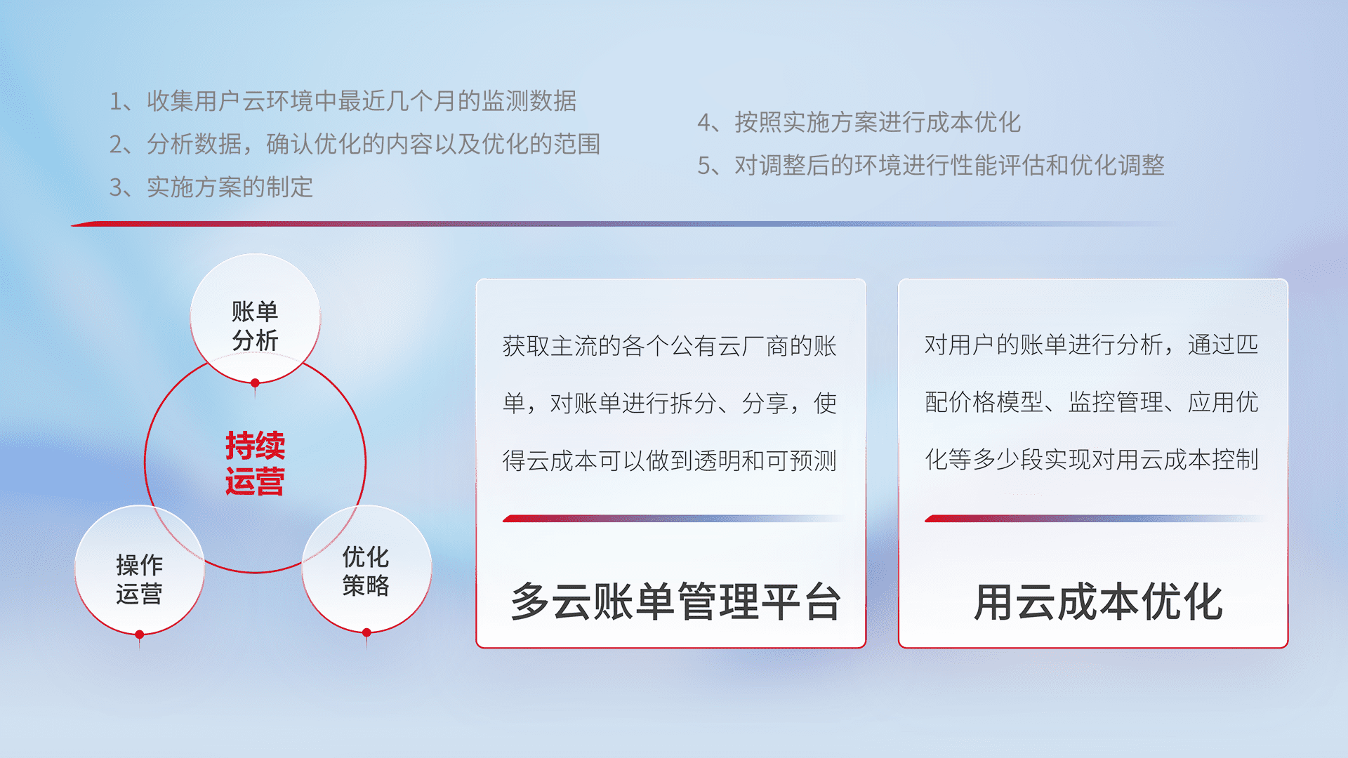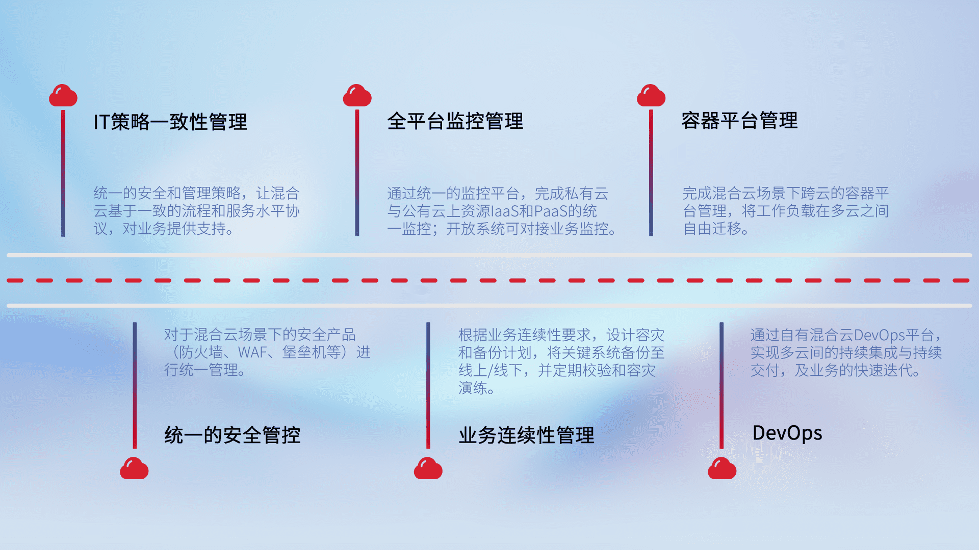 通过多云纳管,,,,以统一的资源数据模型把客户的云资源进行抽象和封装,,,进而实现对多云资源的统一操作,,,,保障云资源管理的可靠性、、、稳定性与可用性。。。量身定制化运维内容,,,配置、、、、开发运维、、、补丁管理、、备份、、监控、、认证和访问管理、、、、审计和日常巡检等,,,,保障在用云过程中的可靠度,,,稳定度以及高可用率。。。