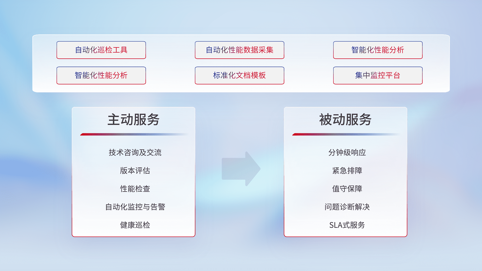 智能化工具和标准化文档,,保障服务质量,,,,提供主动服务(包含技术咨询、、版本评估、、性能检查、、自动化监控与告警、、、、健康巡检)和被动服务包含(分钟级响应、、、紧急排障、、、、值守保障、、问题诊断解决、、、、SLA服务)。。